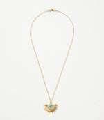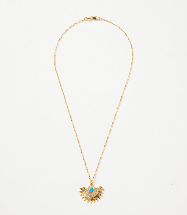 A captivating symbol of protection and clarity, this radiant pendant features a striking turquoise center stone surrounded by shimmering pavé accents. Framed by golden sunburst rays, this eye-catching piece brings a touch of mystical charm and vibrant energy to any look.