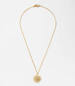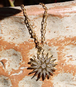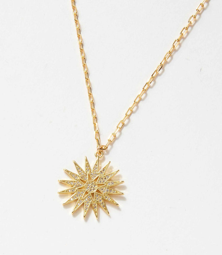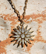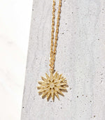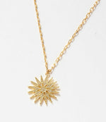 Introducing our exquisite Sunburst Necklace, featuring a dazzling sunburst pendant adorned with sparkling micro pave stones and pave crystals. Elevate your style with this statement piece, perfect for any occasion. Experience the radiance and luxury of our sunburst necklace today.