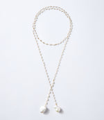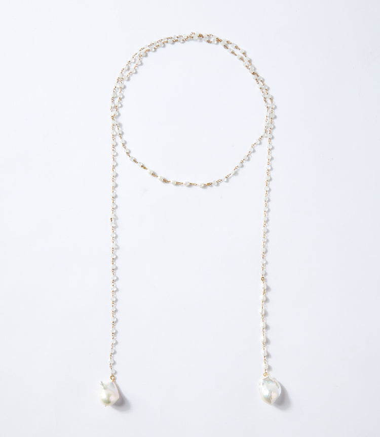 A luminous pairing of glowing moonstone and soft, iridescent mother of pearl, this necklace captures quiet elegance and celestial charm. Designed as a single long strand with no closure, it invites you to wrap it to your desired length—creating a custom, layered look with radiant ease. The natural shimmer of each element creates a harmonious glow, perfect for adding a touch of light to any ensemble.