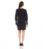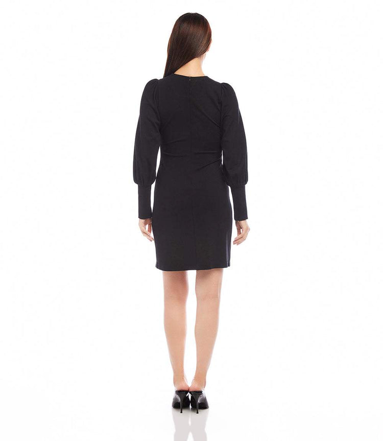 Petite size black bishop sleeve dress with wide cuffs and crew neck on model