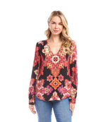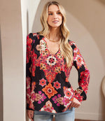 This long sleeve blouse features a flattering u-neckline and a bold medallion floral print that adds instant impact. Finished with a curved hem and easy drape, it pairs effortlessly with jeans or skirts for a polished yet relaxed look.
