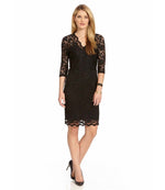 Petite size V-neck black scallop lace dress with 3/4 sleeves and floral pattern