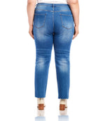 Plus size raw hem straight leg jeans in stretch denim with high rise and five pockets