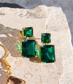 Featuring striking princess-cut emerald gemstones, each drop shimmers with rich green depth and regal allure. Set in a sleek, minimalist frame and suspended from delicate hooks, they blend classic glamour with modern refinement.
