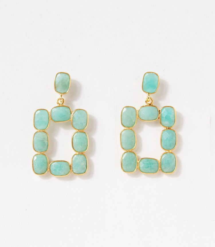 Featuring sleek, rectangular Amazonite gemstones, these earrings capture the subtle elegance of nature’s light. The gemstones iridescent glow creates a captivating effect that shifts with every angle. Set in polished bezel frames, the stones are perfectly showcased, adding a touch of sophistication and timeless charm to any look.