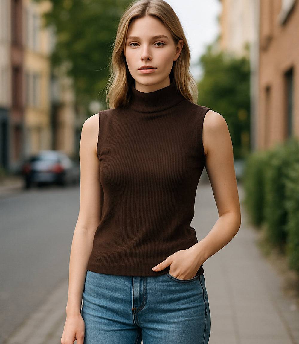 Sleek and soft, this brushed ribbed tank features a cozy turtleneck and a modern sleeveless silhouette. The textured knit adds dimension and stretch, making it an ideal layering piece or standout on its own.