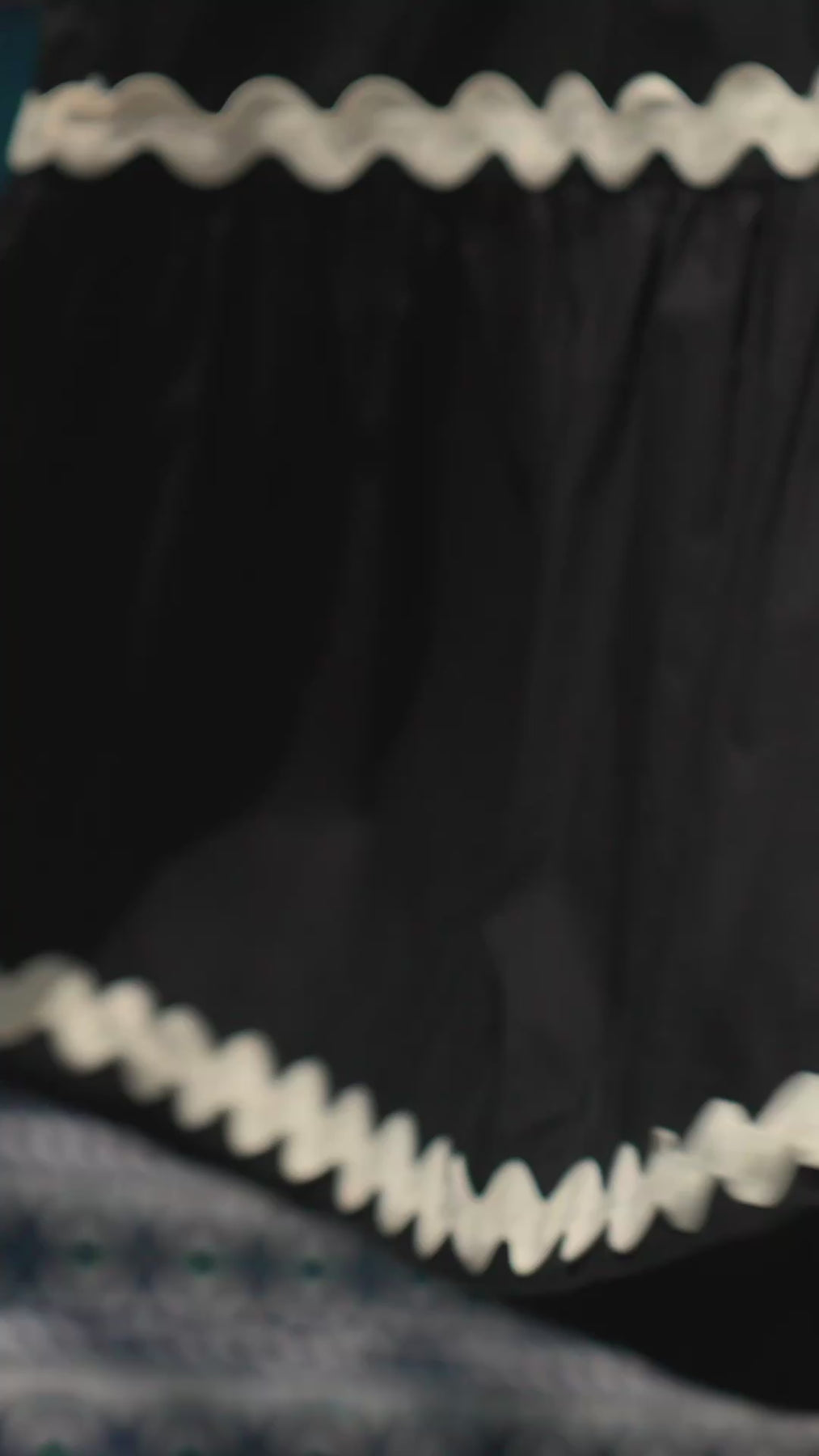 Featuring a flowy, tiered silhouette, this skirt is crafted from black cotton poplin and accented with natural ric rac trim for a striking contrast of color and texture. Designed with a pull-on elastic waistband and side pockets, it offers everyday ease, while the lightweight fabric and midi length make it perfect for any occasion.