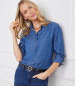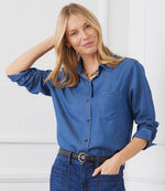 Woman wearing blue ruched 3/4 sleeve button-up shirt with front pocket and tortoiseshell buttons