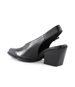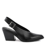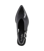 Designed in smooth black leather, this pair features a pointed toe and a bold block heel for the perfect balance of elegance and stability. The adjustable slingback strap ensures a secure fit, while the sculpted silhouette keeps your look sharp and elevated.