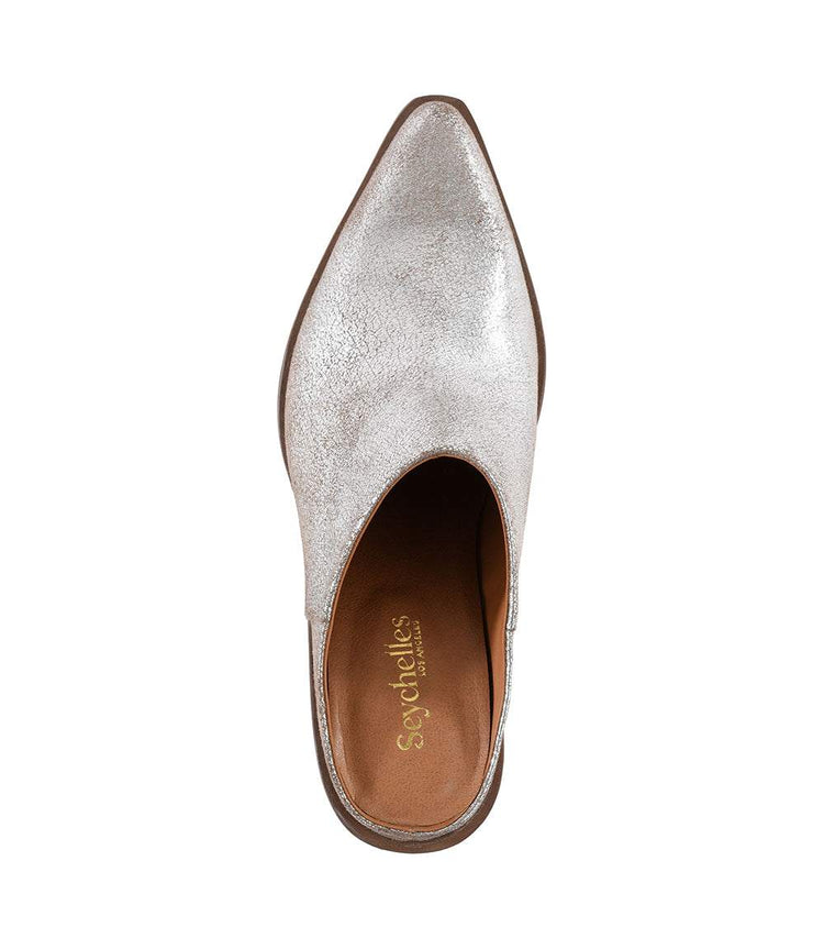 Seychelles Morning Joe mule boots in pewter distressed suede with pointed toe and stacked heel, backless slip-on design