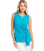 Woman wearing a sleeveless turquoise side drape top with a scoop neck and side tie detail paired with dark jeans in a white room