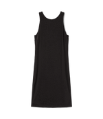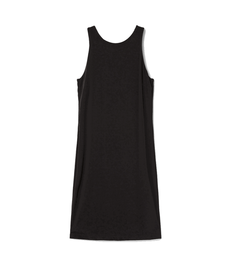 Woman wearing sleeveless black Travel Jersey Dress standing outdoors near pool