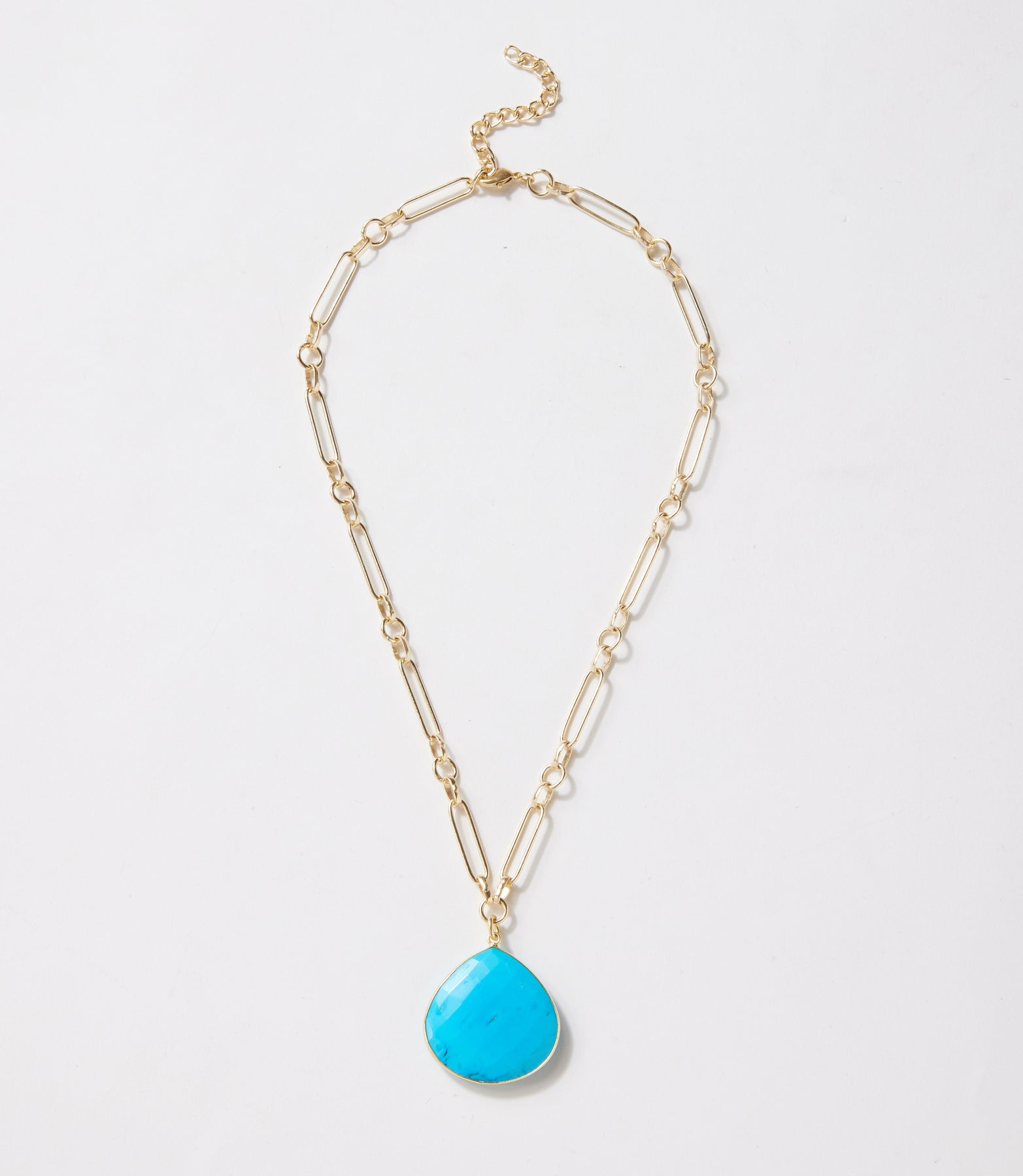 Featuring a faceted turquoise gemstone framed in a gold-tone bezel, it hangs from a stylish paperclip chain for a modern touch. Crafted from turquoise and brass plated in gold, this piece brings a vibrant pop of color and contemporary elegance—perfect for wearing solo or layering with your favorites.